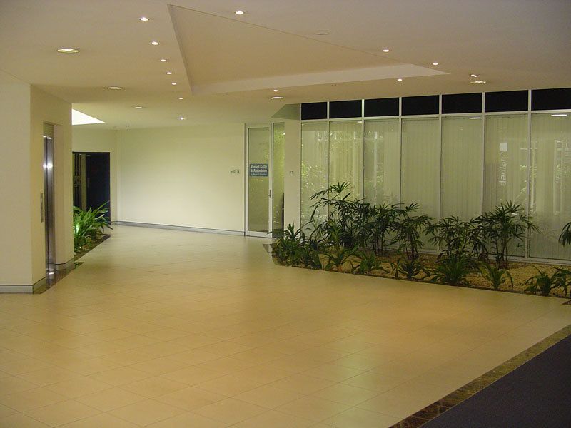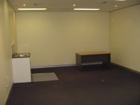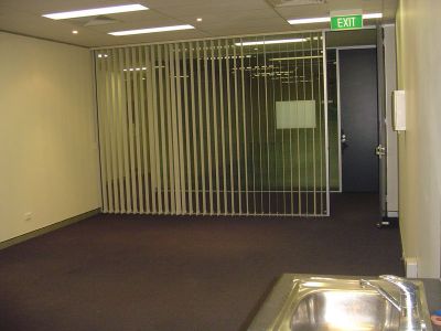 The office suite has its own kitchenette & is air-conditioned, with vertical blinds on the floor to ceiling glass office frontage.